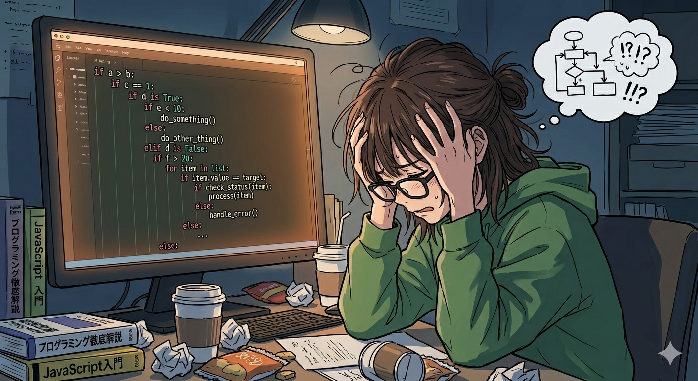 上記で説明はしてきましたが僕も以前、if文に頼ってしまい、分岐が多すぎるコードを書いてしまっていました、、、。